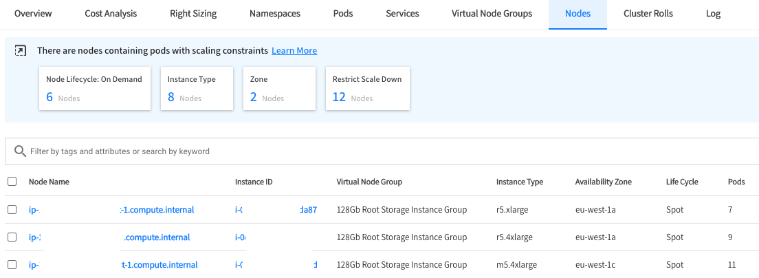 - In the node details, a summary line appears under Pods showing the number of each kind of constraint applied to the pods in that node.